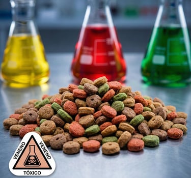 Para durar anos na prateleira, a ração é carregada de BHT, BHA e etoxiquina — substâncias químicas ligadas a problemas hepáticos, renais e até neurológicos em longo prazo.